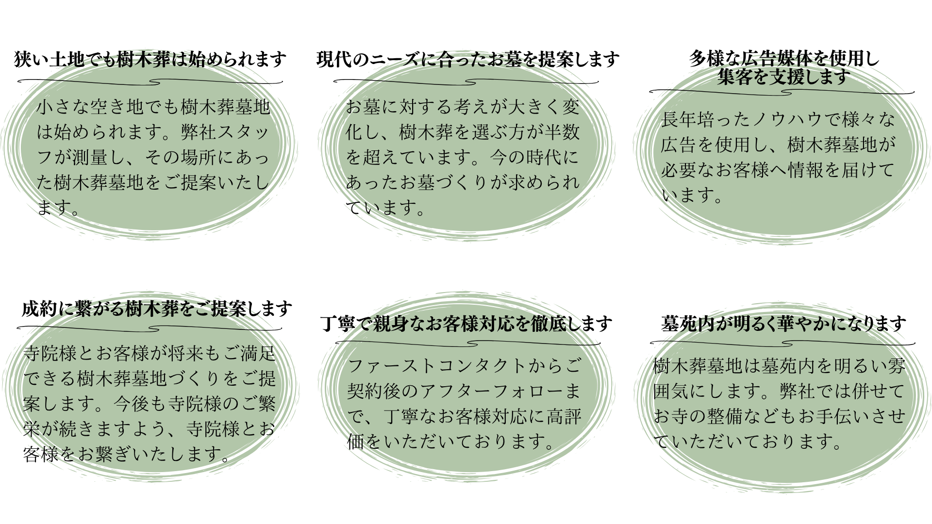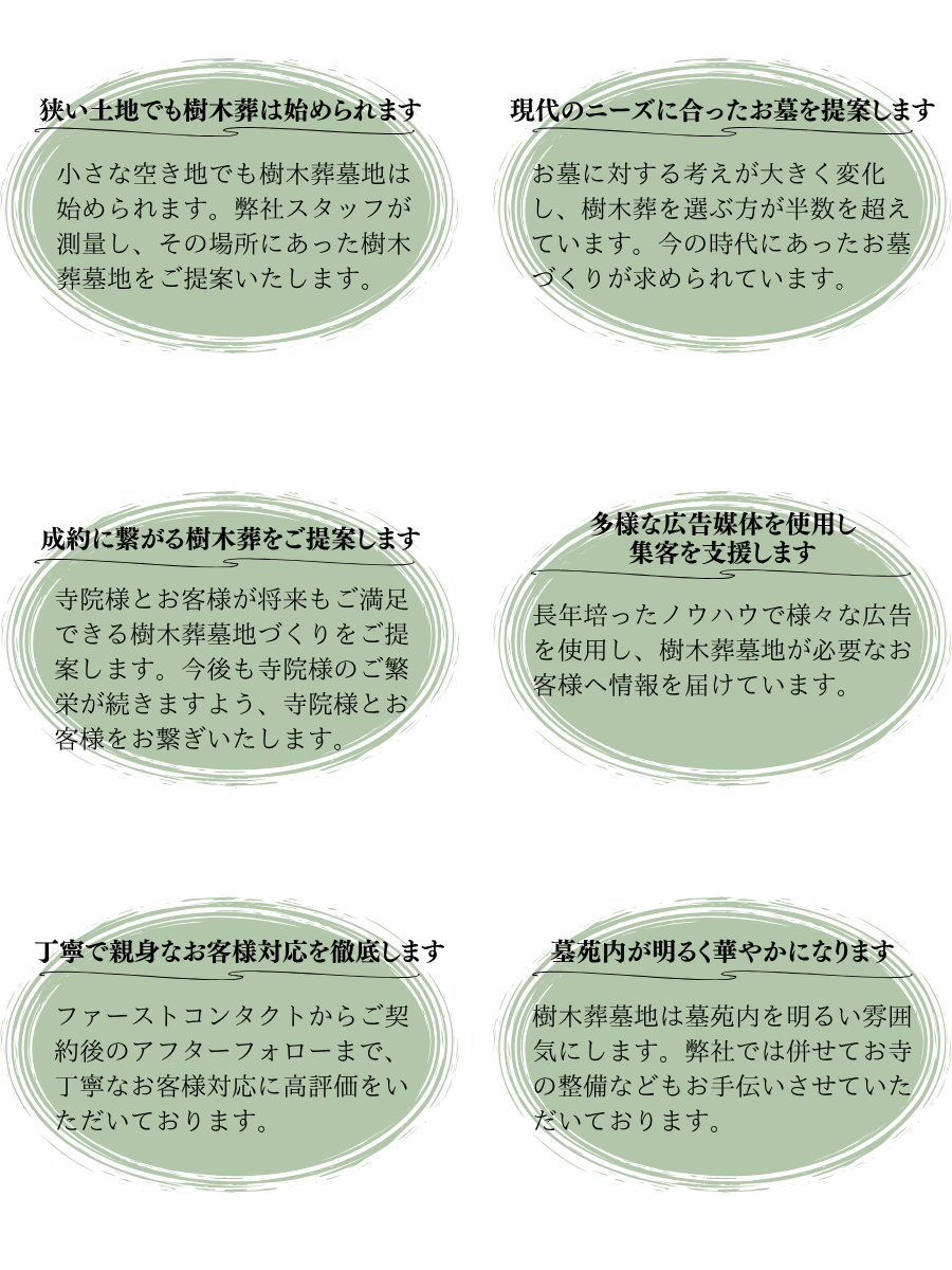 弊社は寺院様とお客様にとって将来も安心できる樹木葬墓地を提案しています。
